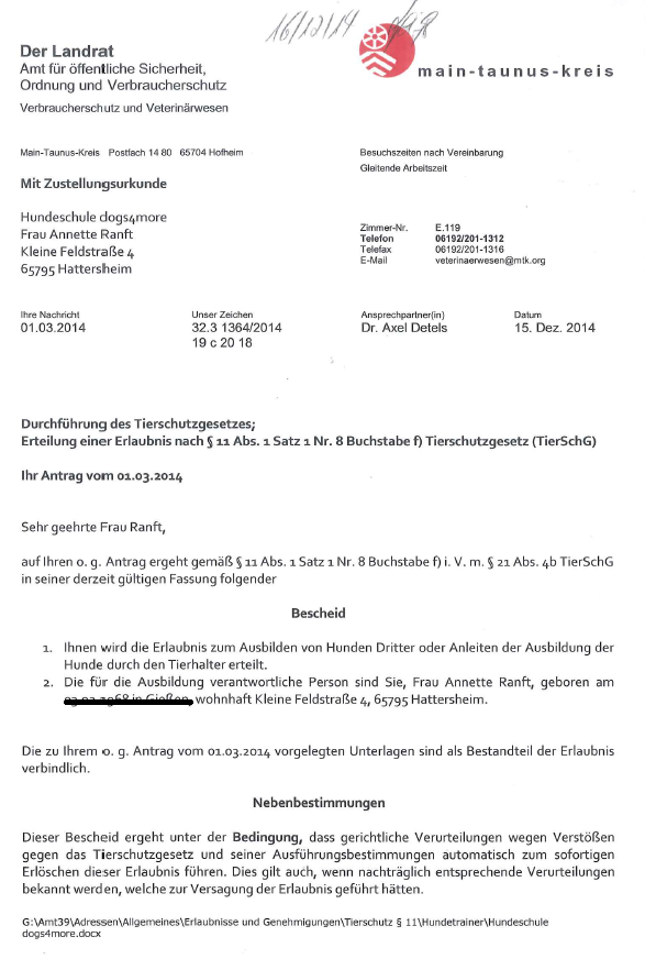 Wer gewerbsmäßig für Dritte Hunde ausbilden oder die Ausbildung der Hunde durch den Tierhalter anleiten möchte, bedarf nach ยง 11 Abs 1 Nr.8 Buchstabe f TierSCHG der Erlaubnis der zuständigen Behörde. Die Erlaubnis wird nach Prüfung der Kenntnisse und Fähigkeiten (Sachkunde) erteilt.
